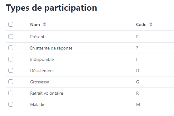 Une liste déroulante permet de choisir le type de "présence". La liste des types de participation est modifiable "Settings" -> "Type de participation".