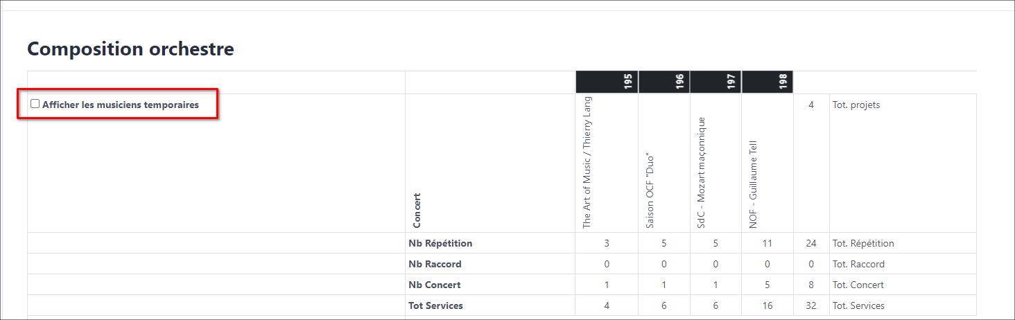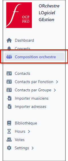 Il est possible de gérer la composition des orchestres depuisle menu "Composition orchestre"