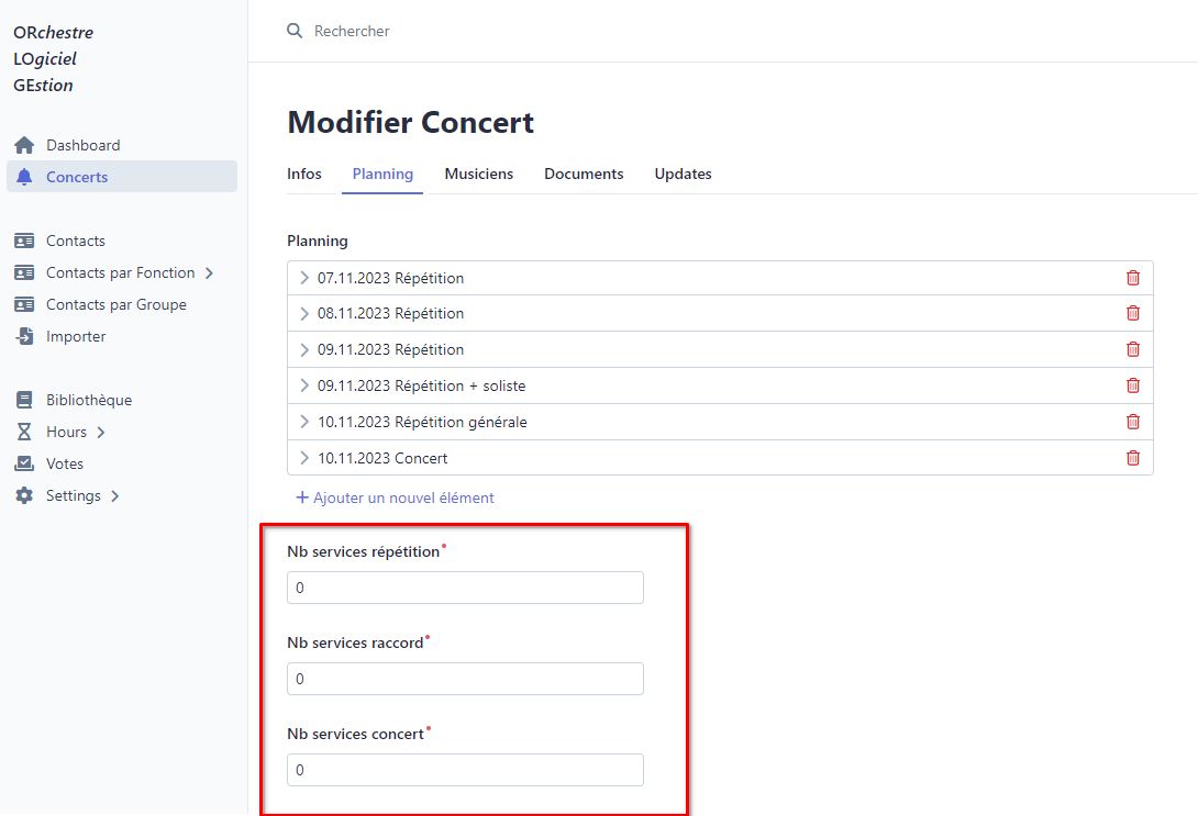 Pour chaque concert, il est possible de définir le nombre de services pour les répétitions, les raccords et les concerts.