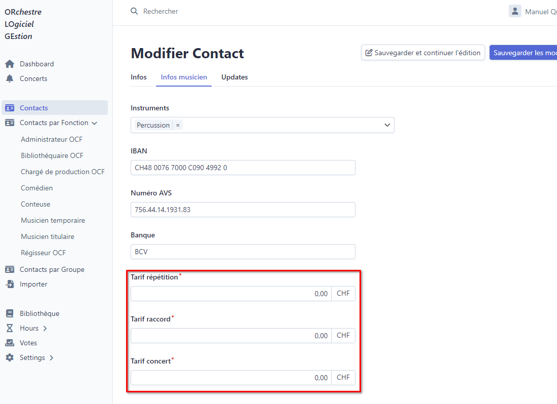 Il est possibe de spécifier un tarif par défaut ainsi que le "Taux LPP" pour chaque type de service, de manière globale ainsi que pour chaque musicien.